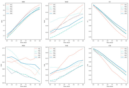 Due to the characteristics of AGRI multi-channel observation, the observation results of AGRI contain information on many different bands. In order to find the most suitable band combination scheme for short-term precipitation forecasting, we evaluate the forecasting performance of the multiple band combination schemes designed in Section 3.3. The evaluation results of the band combination schemes used in this paper are shown in Figure 5, where the horizontal coordinates show the variation of the different forecast lead times and the vertical coordinates show the variation of the precipitation forecasting performance indexes with time. The first row of images in Figure 6 represents three quantitative evaluation metrics, MSE, MAE, and CC, respectively, and the second row of images represents three qualitative evaluation metrics, POD, FAR, and CSI, respectively.