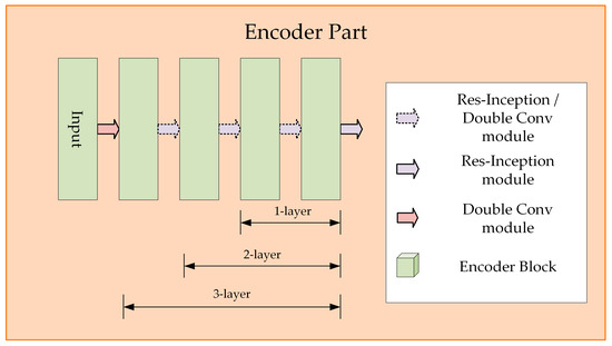 In this section, we conduct ablation experiments to validate the performance contribution of each module in the network for precipitation forecasting, which includes U-Net and Res-UNet using 3D convolution. In order to verify the effect of the number of Res-Inception modules and the number of layers on the precipitation prediction performance of the MCSPF-Net, we designed the MCSPF-Net network with different numbers of Res-Inception modules in the ablation experiments. In the ablation experiment, the position changes of the Res-Inception Module are shown in Figure 8. The figure shows where the different layers of the Res-Inception Module are added in the encoder part. The purpose of adding modules to deeper levels is to ensure that the Res-Inception module receives as much high-level semantic information as possible while reducing the risk of overfitting and minimizing the number of parameters. These experiments are used to quantitatively evaluate the impact of each module in MCSPF-Net on the performance of precipitation forecasting. The same quantitative evaluation metrics as in Section 4.1 were used in the ablation experiments, including POD, FAR, CSI, MSE, MAE, and CC. The average quantitative evaluation results of all the models in the ablation experiments are shown in Table 4. The layers marked behind the MCSPF-Net in Table 4 represent the number of the Res-Inception modules included in the model.