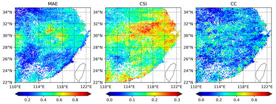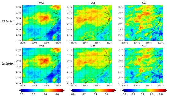 The spatial distributions of the metrics over time for the precipitation forecasting results of MCSPF-Net are shown in Figure 9, using MAE, CSI and CC as the evaluated metrics, respectively. During the evaluation process, the spatial distribution statistics were conducted using the test dataset. The GPM-IMERG Final-Run product was chosen as the true value against which the model forecasting was compared. In Figure 9, the spatial distributions of MAE, CSI and CC for precipitation forecasting results are shown from left to right, and the variation of the metrics from 30 to 240 min of forecast lead times are shown from top to bottom, respectively.