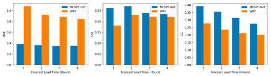 A comparison of precipitation forecasting results between MCSPF-Net and WRF is shown in Figure 11. According to Figure 11, the MAE of the MCSPF-Net network in the 4 h forecast experiment is significantly lower than that of WRF. For CSI and CC, the MCSPF-Net results obtain higher scores and more uniform distribution of the metrics. In addition, the WRF forecasts have a trend of increase and then decrease in the CSI metric. This indicates that the WRF is affected by the initial field accuracy in the short-term forecast. The evaluation results in Figure 11 illustrate that MCSPF-Net is able to better capture short-term precipitation patterns than WRF. Furthermore, MCSPF-Net exhibits a heightened accuracy in forecast future precipitation, obtaining a precipitation forecasts result that is closer to the actual situation. This attests to MCSPF-Net’s advanced predictive prowess, particularly in its capacity to provide more precise and reliable short-term precipitation forecasts. Meanwhile, we calculated the average assessment metrics of the forecast results for MCSPF-Net and WRF at different forecast lead times, and the results are shown in Figure 12.