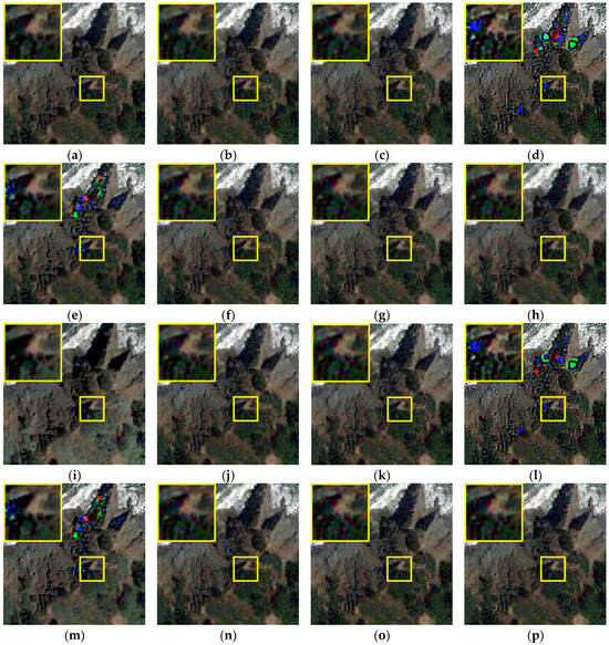 Figure 8. Visual comparison of data of F-QB-sharpened results. The upper left area corresponds to the zoomed-in image of the yellow boxed area in the image. (a) GLP. (b) GLP (BPT). (c) GLP (BPI). (d) GLP (EBP). (e) GLP (FE-BP). (f) GLP (FBP). (g) GLP (SSBP). (h) GLP (FSSBP). (i) GS. (j) GS (BPT). (k) GS (BPI). (l) GS (EBP). (m) GS (FE-BP). (n) GS (FBP). (o) GS (SSBP). (p) GS (FSSBP).
