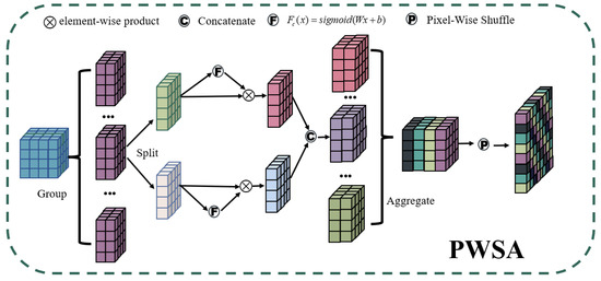 The flow of features in the PWSA module is as follows: Firstly, the input features are processed in a group-wise manner. Specifically, the input features are divided into g groups in the channel dimension, where the channel dimension of each group is . Then, the features of each group are equally divided, resulting in a channel dimension of for each part. The two parts of features are separately enhanced in the spatial dimension and channel dimension, and then aggregated by concatenating them to reduce the number of parameters. Subsequently, each group of features is aggregated. Finally, the Pixel-Wise Shuffle operation is adopted to integrate the features into the form of , enabling the communication of information across different channels while improving the resolution of the target.