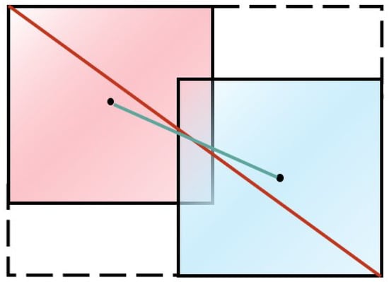 As shown in Figure 8, each box represents a pixel, and the dashed line indicates the minimum closure of the two bounding boxes. The red box represents the ground truth, and the blue box represents the anchor. For a more intuitive presentation, we set the aspect ratio of the two boxes to 1 to represent the bounding box regression for small pixel targets. The CIOU of the two bounding boxes is calculated according to Equations (4)–(7). The CIOU value of Figure 8a is 1.25, and Figure 8b is 0.8125; the increment of the IOU value is 0.4375. It can be explicitly seen that the variation of CIOU is one-third of the initial value after moving only two pixels.