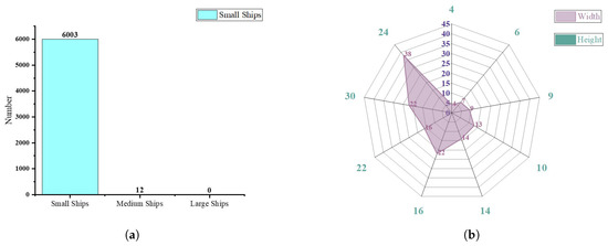 In our experiments, we used LS-SSDDv1 [52] as the benchmark dataset. LS-SSDDv1.0 is a large-scale small SAR ship detection dataset. The relevant information can be referred to Table 1. Due to the excessive aspect ratio of individual images, they are cropped to 800 × 800 in the official dataset to facilitate computer processing and readability. The ratio of the training set and validation set is 2:1, with a total of 9000 images. We counted the scales of the ships in LS-SSDDv1.0, and the statistics are shown in Figure 9a. At the same time, we utilize the k-means method in all labels to determine the hyperparameters of the anchors, and the results are depicted in Figure 9b. Based on the results, it can be observed that the dataset primarily consists of small-sized ships, with a majority of them being below 32 × 32 pixels. Consequently, detecting these small ships poses significant challenges.
