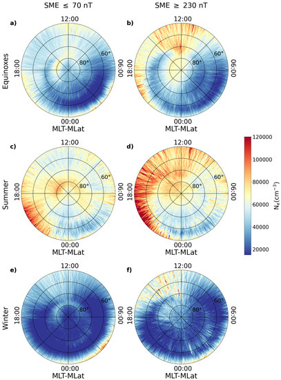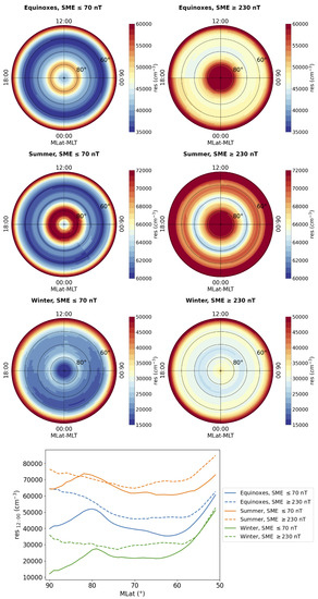 The six-year data collection period allowed for a robust analysis of electron density distribution at medium and high latitudes (above magnetic latitude) in the Northern Hemisphere during a period of low solar activity, as indicated by an average value of the solar radio flux at 10.7 cm (2800 MHz) of 80 sfu (solar flux units). Moreover, the collection period enabled the investigation of seasonal variations and their impact on density patterns. To investigate this, the dataset was divided into segments based on the local seasons, with the equinoxes and solstices at the center. Each year was divided into four periods of three months each in order to more accurately capture the seasonal changes. This segmentation approach ensures that the observed spatial distribution of the electron density reflects the corresponding solar illumination conditions at the satellite’s position. Furthermore, to examine the effect of geomagnetic activity on the distribution of electron density, we divided the dataset into two distinct periods, one corresponding to a period of low geomagnetic activity and the other to a period of high geomagnetic activity. These periods were identified using the SME index, which supplements the AE index and was obtained from the SuperMAG global magnetometer network [15]. We used the SME index [16] instead of the well-known AE index [17], as the latter was not available for the entire time period under analysis. Previous scientific studies [18] have shown that, similar to the AE index, the SME index represents a reliable indicator of geomagnetic activity at high latitudes. While the SME index uses the same calculation methodology as the AE index, it uses a much larger number of magnetometer stations, typically ten times more than the original index. This increased station coverage makes for improved precision in capturing the dynamics of geomagnetic disturbances by improving the accuracy of timing, intensity, and event location determination. To differentiate between low and high geomagnetic activity within the dataset, we used two SME thresholds, one set at 70 nT and the other at 230 nT, as these thresholds corresponded to the 25th and 75th percentiles of the cumulative distribution during the chosen period. SME values of less than 70 nT indicate periods of low geomagnetic activity at high and middle latitudes, while values greater than 230 nT identify periods of geomagnetic disturbance at these latitudes.