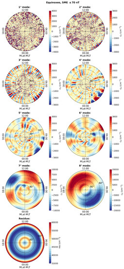 Polar view of the eight modes and the residue obtained from the MEMD of electron density distribution during the equinoctial period, in the Northern Hemisphere, when geomagnetic activity is low. Maps are represented using the QD–magnetic latitude (MLat) and MLT reference system. The concentric circles are plotted in intervals, with the outermost circle corresponding to .