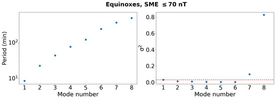 We examined any variations with the latitude in the average period value for each of these four modes by conducting a comprehensive analysis of the periodicities of the modes in MLT belonging to the second class. The periodogram for a given magnetic latitude value was computed by taking into account the series of density values corresponding to different MLTs. This entailed analyzing 40 distinct periodograms for each mode obtained from a series of 360 data points, with a resolution of 1 for both magnetic latitude and MLT. The fundamental frequency value was calculated from each periodogram based on the peak position. The average period was then calculated using the frequency values in MLT, with the period found to be practically constant with the latitude for all four analyzed modes. The average periods obtained for each one of the four modes are (), (), (), and () min. These periodicities are in good agreement with the harmonics and subharmonics of the satellite’s orbital period (∼94 min). In other words, the spatial structure of the electron density distribution associated with these modes closely resembles the satellite traces, implying a possible link to the data acquisition process. However, we note that these modes do not contribute significantly to the overall decomposition, because their energy remains lower than that of the first one. As a result, we combine this second class of modes together and consider a smaller number of modes for further analysis.