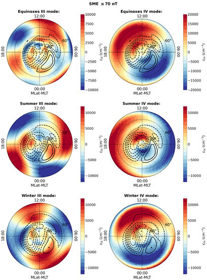 To gain insight into the dynamic processes that contribute to the distribution of electron density for these two modes regardless of season or activity level, convection cell structures are overlaid onto the maps depicting these modes. At high latitudes, the ionized region of the upper atmosphere undergoes a dynamic circulation known as convection driven by the interaction of the magnetized solar wind and the Earth’s magnetosphere. This convection is important in determining the distribution of electron density in the ionosphere. The convection patterns are twin-celled in nature, with the flow moving away from the Sun at the poles and toward the Sun at lower latitudes. The strength of this circulation is influenced by the north–south component of the IMF (represented as ), while any asymmetries between the dawn and dusk regions are associated with the east–west component of the IMF (). In general, convection exhibits a highly dynamic nature, displaying sensitivity to intermittent phenomena such as variations in the IMF and magnetospheric processes such as substorms. One effective method for capturing and analyzing these convection patterns is to utilize data from the Super Dual Auroral Radar Network (SuperDARN). SuperDARN is a widespread network of scientific radars designed to monitor the near-Earth space environment. Each radar within the network is capable of measuring the velocity of ionospheric plasma. By combining data from multiple radars, a comprehensive view of plasma motion in the polar ionosphere can be obtained, enabling studies on the electromagnetic interaction between the solar wind and Earth’s magnetosphere [34]. Using a long period of SuperDARN data, a dynamic model of convection can be constructed to enable the precise determination of the electrostatic potential distribution in high latitude regions for a wide range of solar wind, IMF, and dipole tilt parameter values [35]. In our case, we obtained representative average convection motions that reflect the interplanetary conditions underlying the originated data by calculating the mean values of the x-component of the solar wind velocity (), the y- and z-components of the magnetic field, and the dipole tilt for each of the six different datasets analyzed and presented in Figure 1. The obtained values, which refer to the time intervals used to build the different datasets, were then incorporated into the CS10 model [36], enabling us to obtain the average trends of the electrostatic potential distribution. Table 1 reports the values of the solar wind velocity, the two components of the magnetic field, and the dipole tilt used in the different cases. Figure 6 illustrates the spatial and temporal distributions of the electron density for the third and fourth fundamental modes obtained from decomposition during low geomagnetic activity. The figure consists of six maps, with each pair representing the III and IV modes for the analyzed equinoctial, summer, and winter periods. Each map includes the average electrostatic potential level curves overlaid on top of the electron density spatiotemporal distribution. Similarly, Figure 7 follows the same structure as Figure 6 with a focus on the period of high geomagnetic activity.