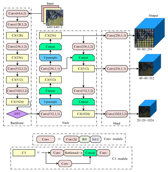 Figure 1 illustrates the network architecture of YOLOv5, which incorporates mosaic data augmentation and adaptive pin-frame computation techniques to enrich the dataset and obtain an optimal size suitable for the dataset. The backbone network primarily consists of CBS (Conv + BatchNorm + SiLU), C3, and SPPF modules. During the feature extraction stage, the preprocessed image serves as input to the backbone network, which extracts features from various layers corresponding to the target being detected. These extracted features are subsequently fused in the feature fusion network. The Neck component of YOLOv5 is responsible for integrating features from different scales and levels. The Head component performs multi-scale detection on feature maps of varying sizes, ultimately yielding the coordinate positions and sizes of the target boxes.