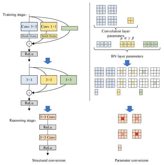 The remaining identity branches can be treated as a volume layer with a weight of , allowing for the application of conversion. By incorporating biases into the three branches, the final bias weight can be obtained. This module can be considered to be a convolution module, and the reasoning process can be viewed as a single-road architecture stacked using this convolution module.