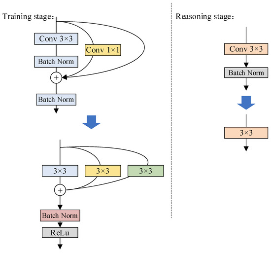 According to the current algorithm network structure and performance, it can be concluded that incorporating a multi-branch architecture during the training process is beneficial for improving accuracy. However, during the inference process, the use of the multi-branch architecture can impact reasoning speed, which may be insufficient for achieving faster reasoning. To address this limitation, a novel network architecture called RepVGG was proposed in the literature for the first time [18]. The RepVGG training process employs a multi-branch structure, consisting of Conv, Conv, and residual branches, which enhances discoverability. In contrast, the reasoning process adopts a single-road minimalist architecture, significantly boosting inference speed. Refer to Figure 2 for a visual representation of this architecture.