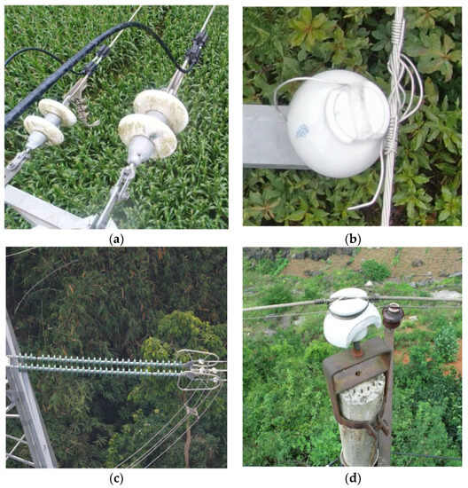 Pictures of insulator defects: (a) Insulator fouling; (b) loosening of insulator tie lines; (c) spontaneous detonation of insulator; (d) broken insulator.