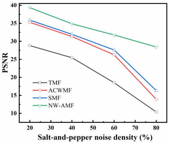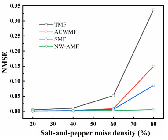 Based on the graphical data, it is evident that the NW-AMF algorithm attains superior PSNR values and lower NMSE values when confronted with pretzel noise density values of 0.2, 0.4, 0.6, and 0.8. This observation signifies the algorithm’s heightened filtering performance. Notably, as the noise density gradient increases, the performance indices of the SMF algorithm, ACWMF algorithm, and TMF algorithm undergo significant changes, indicating a notable decline in their filtering performance. Conversely, the NW-AMF algorithm exhibits a more gradual alteration in the aforementioned indices, thereby maintaining a superior performance index even under the influence of 0.8 density salt-and-pepper noise. Consequently, the algorithm proposed in this study demonstrates a consistent and stable ability to remove salt-and-pepper noise of varying densities. Hence, it can be inferred that the algorithm presented in this paper possesses a reliable capacity to eliminate pretzel noise of different densities.