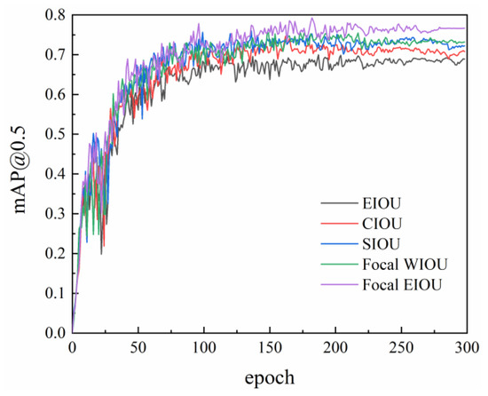 To validate the efficacy of the loss function, the experiments were conducted in accordance with the prevailing trend of conducting ablation experiments on loss functions. YOLOv5-6.0, which employs the CIOU loss function, served as the baseline for comparison. Consequently, the loss function was substituted with EIOU, Focal EIOU, Focal WIOU, and SIOU. The outcomes of these experimental iterations are presented in Table 8.