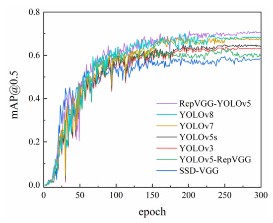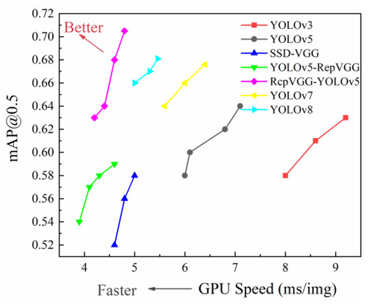 Figure 12 provides a clear visualization of the superior comprehensive performance (mAP) exhibited by the RcpVGG-YOLOv5 algorithm compared to the other algorithms. Furthermore, Figure 13 and Figure 14 demonstrate that RcpVGG-YOLOv5 achieves the highest accuracy and exhibits the most robust convergence under complex conditions. Ultimately, the superiority of RcpVGG-YOLOv5 is visually evident in Figure 15.