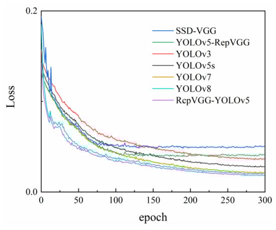 To verify the effectiveness of the RcpVGG-YOLOv5 algorithm following enhancements to the primary network, a detection contrast analysis is conducted using an image density of 0.4. The detection performances of YOLOv5s [20], YOLOv5-RepVGG [25], YOLOv3 [19], SSD-VGG [17], YOLOv7 [41], and YOLOv8 [42] are compared, and the results are presented in Table 9.