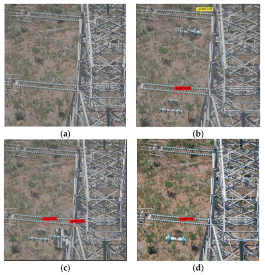 Broken insulator defect: (a) VGG/RepVGG; (b) YOLOv5s; (c) YOLOv3; (d) RcpVGG-YOLOv5.