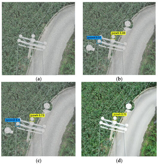 Spontaneous detonation of insulator defect: (a)VGG/RepVGG; (b) YOLOv5s; (c) YOLOv3; (d) RcpVGG-YOLOv5.