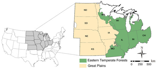 The Midwest contains twelve states. Counties in the experimental site are in two distinctive ecological zones, including the Eastern Temperate Forests (ETFs) and the Great Plains (GPs).