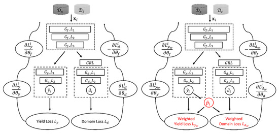 To improve the transferability of DL models, the DANN model [47] has been proposed to address the issue of domain shift by projecting input features from each domain into a common subspace via adversarial learning. It mainly has three components: a feature extractor , a yield predictor , and a domain discriminator (Figure 2 (left)). These components are trained end-to-end, enabling the model to learn and adapt to different domains. Specifically, during the feed-forward process, the th input data from either or is initially passed through to extract cross-domain features (Equation (4)). The extracted features from is further passed through for yield prediction and the predicted yield is outputted (Equation (5)). Meanwhile, the extracted features from both domains are fed into for domain classification and the domain label is outputted (Equation (6)), which identifies the domain that the input originates from.