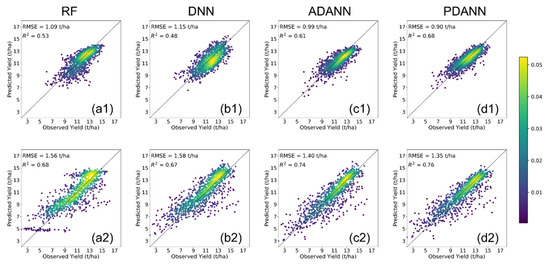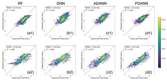 In order to visually demonstrate the level of agreement between reported and predicted yields, we present the density scatter plots in Figure 3 and Figure 4. In all cases, the proposed PDANN model demonstrated the highest level of agreement (Figure 3(d1,d2) and Figure 4(d1,d2)). Specifically, owing to the domain shift between ETFs and GPs, predictions by RF and DNN tend to be biased. However, such biases are not consistent between low yield counties and high yield counties. For example, since the crop yields are comparatively lower in the GP, the RF and DNN were observed to underestimate the crop yields in ETF when trained with labeled data in GP for both corn and soybean. On the other hand, as shown in Figure 3(a2,b2) and Figure 4(a2), the ETF → GP yields were overestimated for the RF and DNN. Similarly, as shown in Figure 4(b2), the low yield counties (less than 10 tons/ha for corn and less than 3 tons/ha for soybeans), were overestimated for ETF → GP while the high yield counties were underestimated. After UDA, both the ADANN and the PDANN reduced the bias and achieved better agreement. Moreover, the scatter plots of the PDANN were more compact and less variant than the ADANN model’s, suggesting its superior performance.