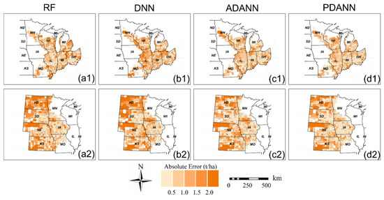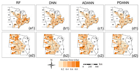 Finally, we present in Figure 5 and Figure 6 the average absolute error maps from 2019 to 2021 for corn and soybean yield prediction, respectively, with darker colors indicating larger absolute error values for each model. The results showed that RF and DNN models exhibited smaller errors in states near the boundary of ETF and GP, such as IL (Figure 5(a1) and Figure 6(b1)), while a cluster of large errors was observed in states distant from the other domain, such as OH, IN, ND, SD, and western NE. This is because the domain shift would be more significant in areas located away from the source domain. Compared to the RF and DNN, the ADANN model eliminated most error clusters and reduced absolute errors in ND, SD, and IN (Figure 5(c1,c2) and Figure 6(c1,c2)). The PDANN further improved the prediction accuracy compared to the ADANN. It had smaller errors in most counties, especially in IA for corn yield prediction (Figure 5(d2)) and in NE and KS for soybean yield prediction (Figure 6(d2)).