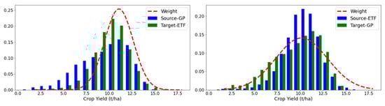Histograms of soybean yields in each domain along with the learned weight distribution by the PDANN model in the year 2021 under GP → ETF (left) and ETF → GP (right).