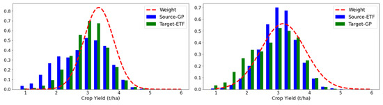 To explore the weighting mechanism in the proposed PDANN, we depicted the calculated weights for the PDANN together with the yield distributions in each domain (Figure 7 and Figure 8). Given that consistent results were obtained over multiple years, we have presented the results in 2021 as a representative example.