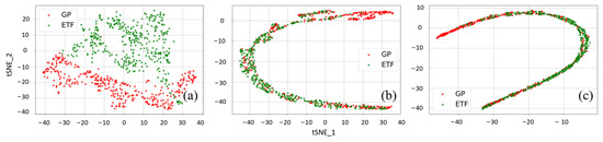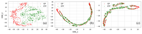 As shown in Figure 9 and Figure 10, we present the t-SNE visualization of the original input features and cross-domain features extracted by the PDANN in the transfer experiments in 2021. The original input features were mapped from the original feature space with a length of 126 to the 2D space (Figure 9 and Figure 10a). Similarly, the extracted features were mapped from the subspace with a length of 64 to the 2D space (Figure 9 and Figure 10b,c). Data samples from the GPs and ETFs are color-coded by green and red, accordingly. Similar samples are supposed to be close while dissimilar samples are distant.