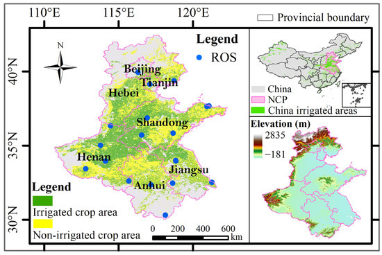 Location of the North China Plain (NCP) and its topographic elevation map, as well as spatial distribution of the irrigated and non-irrigated crop areas and radiation observation stations (ROS) in the NCP.