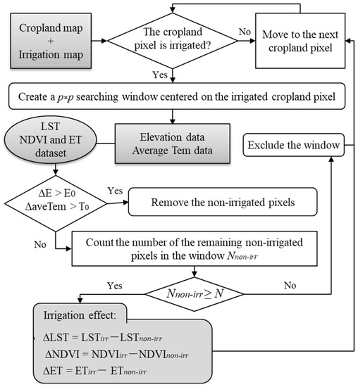 where LST is the land surface temperature; Tem is the air temperature; and the subscripts “irrigated” and “non-irrigated” represent the irrigated pixel and adjacent non-irrigated pixel, respectively; all the units are in °C. The key element is determining how to select the irrigated and non-irrigated pixel for comparison. Based on the self-adaptive moving window searching strategy of Yang et al. (2020) [32], we adapted their “self-adaptive moving window” to a fixed-size moving window suitable for the NCP. When detecting the irrigation effect, it is necessary to constrain the influence of different background conditions in the window, such as terrain fluctuation and meteorological differences; therefore, the irrigated and non-irrigated pixels must be close enough to have a similar climate, and their elevation difference and meteorological difference are small. To satisfy the criteria above, Yang et al. limited the elevation difference (ΔE) between irrigated and non-irrigated pixels when detecting the effect of irrigation on LST. On this basis, we eliminated the influence of meteorological differences on ΔLST by restraining the average air temperature difference (ΔaveTem) between the irrigated and non-irrigated pixels in the window. In addition, we used a similar module to detect the ICE based on ΔDCT. The effects of irrigation on NDVI, ET, Tem, and precipitation were also studied using the same strategy. The searching strategy of the improved moving window algorithm is provided in Figure 2.