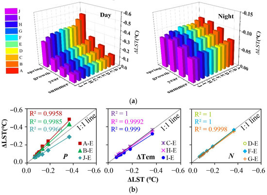 Sensitivity analysis of parameters p, ΔTem, and N. The default setting is E with p = 31, ΔTem = 0.3, and N = 15. The comparison settings fix two parameters and set different values for the other parameter; p is 51, 41, and 21 in A, B, and J; ΔTem is 0.2, 0.5, and 0.7 in ℃, H, and I; N is 10, 20, and 5 in D, F, and G. (a) Comparison of the average annual daytime and nighttime ΔLSTs obtained under different settings; (b) correlation between the ΔLSTs of the default setting and comparison settings.