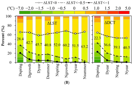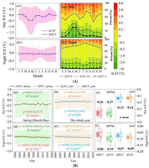 The daytime ΔLST and ΔDCT (ΔLSTd and ΔDCTd) had the same apparent seasonal variation (Figure 4A). They showed a stronger ICE during the growing season (March–September) than the non-growing season, and the daytime ICE (ICEd) was much higher than the nighttime ICE (ICEn, mean value < 0.1 °C, Figure 4B(f)), especially during spring; however, the nighttime ΔLST (ΔLSTn) was generally smaller than the nighttime ΔDCT (ΔDCTn) during the growing season (Figure 4A(b1)), which indicates that ICEn based on LST was stronger than that based on DCT. The strongest ICEd occurred from April to May, with an average ΔLSTd and ΔDCTd of −0.47 °C (Figure 4A(a1)). The strongest ICEn based on LST and DCT occurred in May and June–August, with an average ΔLSTn and ΔDCTn of −0.13 and −0.08 °C, respectively (Figure 4A(b1)). During the growing season, the percentage of negative ΔLSTd varied from 55% to 78%, with more than 15% less than −1 °C (Figure 4A(a2)), and the average ICEd varied from −0.06 to −0.47 °C, with an average of about −0.22 °C (Figure 4A); however, during the non-growing season, the percentage of ΔLST < −1 °C was only around 4%, and the average ICE was about −0.03 °C (Figure 4A).