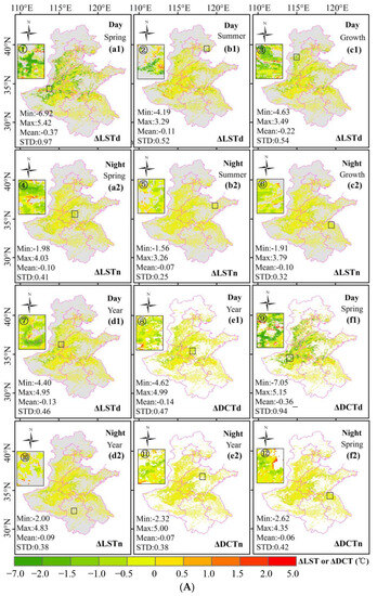 In this study, the ΔLST and ΔDCT were used to characterize the ICE on LST, respectively. They were defined as