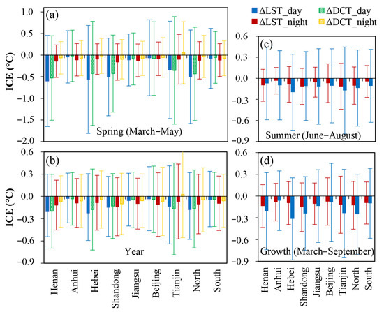 The annual average ICEs (ΔLST and ΔDCT ± SD) in different administrative districts of the NCP during spring (a), the whole year (b), summer (c) and growing season (d). The North and South represent the northern and southern parts of the NCP, respectively. ΔLST and ΔDCT indicate the land surface temperature (LST) and DCT (LST−air temperature) differences between irrigated and non-irrigated areas.