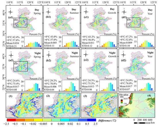 The differences between ΔLSTdem and ΔLST in the different seasons over the NCP cropland; (a1–d1) and (a2–d2) are the daytime and nighttime differences between ΔLSTdem and ΔLST during spring, summer, growing season and the whole year, respectively; (1)–(3) show the details within the box in the subfigures (a1,a2,d1); and (4) shows the elevation within the box. ΔLSTdem was calculated by the previous algorithm (Yang et al. [32]), which does not directly control the meteorological difference between irrigated and non-irrigated pixels in the moving window; ΔLST was the land surface temperature (LST) differences calculated in this study. Difference = ΔLSTdem − ΔLST, °C.