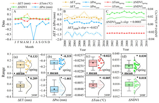 Seasonal (A) and annual (B,C) variations of the average ΔET, ΔPre, ΔTem, and ΔNDVI over the NCP cropland from 2000 to 2015; (a–d) are box plots showing the dispersion of spring and annual ΔET, ΔPre, ΔTem and ΔNDVI during 2000–2015. ΔET, ΔPre, ΔTem, and ΔNDVI are the difference of ET, precipitation, air temperature, and NDVI between irrigated and adjacent non-irrigated areas. Negative numbers indicate that irrigation had an inhibiting effect on the index. *, p < 0.05; ***, p < 0.001.