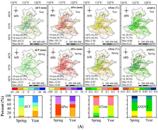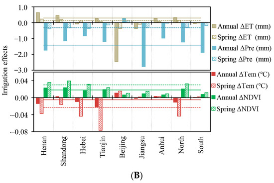 From 2000 to 2015, the spring and annual ΔPre varied from −0.112 to −0.451 mm and −1.230 to −1.797 mm, with a mean value of about −0.319 and −1.461 mm (Figure 8B,b). The spring and annual average ΔTem varied around the mean values, about −0.023 and −0.005 °C, respectively (Figure 8C,c). The variation range of ΔET and average ΔNDVI during the spring were 0.012–0.206 mm and 0.026–0.035, averaging about 0.133 mm and 0.03; and those throughout the year were −0.151–0.744 mm and 0.014–0.020, averaging 0.289 mm and 0.018, respectively (Figure 8). Statistically, the annual ΔET and annual average ΔNDVI respectively showed a significant negative (slop = −0.23 mm 10 yr−1, p < 0.05) and positive (slop = 0.003 10 yr−1, p < 0.001) trend during the 16 years. This indicates that the effects of irrigation on ET and NDVI enhanced over time.