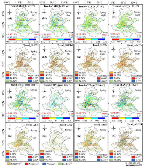 Since the irrigation effects mainly occurred in spring, the Theil–Sen median slope analysis and Mann–Kendall test of the irrigation effect in spring were performed pixel by pixel from 2000 to 2015 (Figure 10). The results show that the trend slopes of the irrigation effects were spatially heterogeneous, as well. The trend slopes of some ΔLSTd were −0.1–−0.65 °C yr−1, and others were 0–0.1 °C yr−1. More than half of the NCP cropland (about 52%, 60%, 51%, and 53%) showed a mean trend of −0.05 °C yr−1, −0.02 °C yr−1, 1.20 mm 10 yr−1, and 0.03 10 yr−1 for ICEd (ΔLSTd and ΔDCTd), ICEn (ΔLSTn and ΔDCTn), ΔET, and ΔNDVI, respectively (Figure 10(a1–e1,h1)). Among them, about 15%, 14%, 5%, and 14% were significant, with a mean trend of about −0.10 °C yr−1, −0.04 °C yr−1, 2.90 mm 10 yr−1, and 0.06 10 yr−1, respectively (Figure 10(a2–e2,h2)). This means that the irrigation cooling effect on LST and promotion effect on ET and NDVI were strengthened. Meanwhile, the rest of ICEd, ICEn, ΔET, and ΔNDVI showed the opposite trends of about the same rate, of which about 14%, 8%, 5%, and 18% were significant trends (Figure 10a–e,h). In terms of the climate factors, although the positive (negative) trends of ΔPre and ΔTem occupied approximately 66% (34%) and 51% (49%), the magnitude of the trends was small, averaging about 0.28 (−0.16) mm 10 yr−1 and 0.006 (0.006) °C 10 yr−1, respectively (Figure 10(f1,g1)). The significant positive (negative) trends of them only occupied 1.30% (0.50%) and 3.01% (3.01%), with a mean trend of 0.66 (−0.39) mm 10 yr−1 and 0.015 (−0.016) °C 10 yr−1 (Figure 10(f2,g2)). This significant trend was mainly distributed in western Shandong and the adjacent eastern Henan (Figure 10), where the irrigated areas are concentrated and flat.