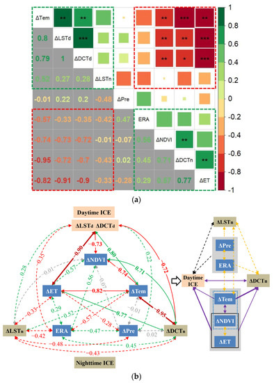 Correlation analysis for examining the driving factors underlying the ICE variation over the NCP cropland. ERA: effective radiation. “Δ” represents the difference of these indicators between irrigated and adjacent non-irrigated areas over the NCP cropland. (a) Color-coded correlation coefficient (Pearson’s r) matrix indicating the interactions of ΔNDVI, ΔET, ΔTem, ΔPre, ERA, and ICE (e.g., ΔLST and ΔDCT) over NCP cropland; *, p < 0.05; **, p < 0.01; ***, p < 0.001. (b) path diagram of correlation network exploring the intrinsic factors driving the ICE. The red, green, and gray arrows indicate negative, positive, and unrelated (|r| < 0.1) relationships, respectively. The solid arrows represent a significant relationship (thick, p < 0.001; thin, p < 0.05); the dotted arrows represent an insignificant relationship (p > 0.05). Numbers adjacent to each arrow are the correlation coefficients. The purple, yellow, and black arrows represent strong (|r| > 0.7), medium (0.4 < |r| < 0.7), and weak (|r| < 0.4) correlations, respectively.