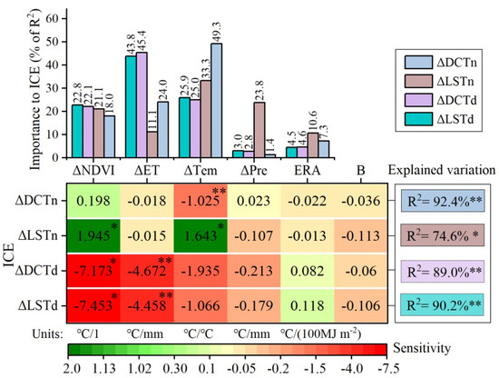 At the regional scale, we quantified the impact of ΔNDVI, ΔET, ΔPre, Δtem, and ERA on ICE, as well as their total contribution and relative importance to explain the ICE variation by multiple regression and variance decomposition analyses (Figure 12). The results show that 92.4%, 74.6%, 89%, and 90.2% variation of ΔDCTn, ΔLSTn, ΔDCTd, and ΔLSTd, respectively, could be significantly explained by other variables in the regression model. ΔET was the most important factor to explain ΔLSTd and ΔDCTd, accounting for 43.8% and 45.4% of R2, followed by ΔTem (25.9% and 25%), ΔNDVI (22.8% and 22.1%), ERA (4.5% and 4.6%), and Δpre (3% and 2.8%). For ΔDCTn and ΔLSTn, Δtem was the most important factor to explain them, accounting for 49.3% and 33.3% of R2, followed by ET (24%), NDVI (18%), ERA (7.3%), Pre (1.4%) and Pre (23.8%), NDVI (21.1%), ET (11.1%), and ERA (10.6%), respectively. ΔLSTd, ΔDCTd, ΔLSTn, and ΔDCTn all showed negative sensitivity to ΔET. When ΔET increased by 1 mm, these measurements decreased by 4.458 (p < 0.01), 4.672 (p < 0.01), 0.015, and 0.018 °C, respectively. That is, the ICE on LST enhanced with the increase in the irrigation-promoting effect on ET. In addition, ΔLSTd and ΔDCTd showed negative sensitivity to ΔNDVI, ΔTem, and ΔPre, and positive sensitivity to ERA. Both ΔLSTn and ΔDCTn showed positive and negative sensitivity to ΔNDVI and ERA, respectively. ΔLSTn showed positive and negative sensitivity to ΔTem and ΔPre respectively, while ΔDCTn showed the opposite. Precisely speaking, for every unit increased in the irrigation promoting effect on NDVI, ICEd enhanced by 7.453 (ΔLSTd, p < 0.05) and 7.173 (ΔDCTd, p < 0.05) °C, but ICEn weakened by 1.945 (ΔLSTn, p < 0.05) and 0.198 (ΔDCTn) °C, and even turned into warming effect. For every unit of ΔTem and ΔPre increased, ΔLSTd (ΔDCTd) decreased by 1.066 (1.935) and 0.179 (0.213) °C (i.e., ICEd enhanced), and ΔLSTn (ΔDCTn) changed by 1.643 (−1.025) °C and −0.107 (0.023) °C, respectively. For every 100 MJ m−2 increased in ERA, ICEd weakened by about 0.1 °C, but ICEn enhanced by about 0.01–0.02 °C.