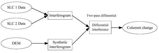 InSAR technology uses two SAR images of the same geographical area, each with slight geometric disparities, to engender the interferometric phase through conjugate multiplication. DInSAR, conversely, extends InSAR by incorporating an external DEM to emulate the terrain phase. The emulated terrain phase is then subtracted from the interferometric phase, thereby yielding surface deformation data. DInSAR includes various modalities, including the 2-pass differential, 3-pass differential, and 4-pass differential. Among these, the 2-pass differential interference technique stands as the most dependable and is compatible with readily accessible external DEM data. The processing sequence for DInSAR 2-pass differential is illustrated in Figure 1.