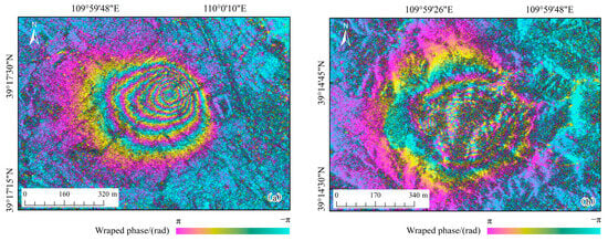 As evident from (9), the accurate unwrapping of the phase initially wrapped in the interferogram, following the deduction of the reference phase from the real deformation phase, is of paramount importance for precise phase retrieval. Within regions characterized by substantial deformation gradients, the processed DInSAR interferograms often exhibit phase discontinuities. Figure 3 depicts both the normal wrapped phase and the wrapped phase with phase discontinuities.
