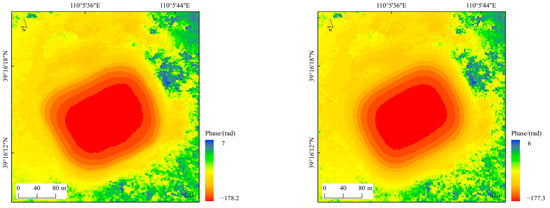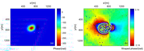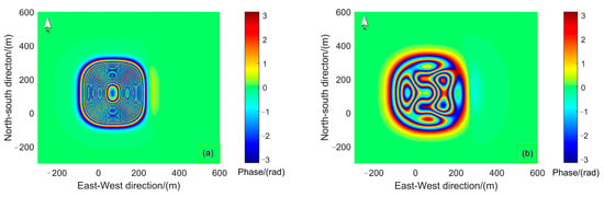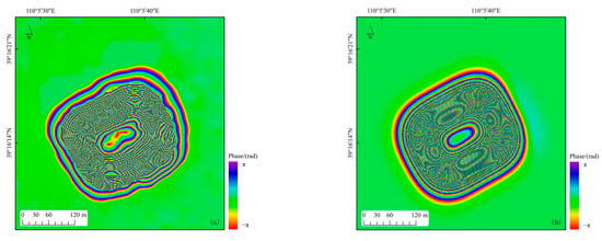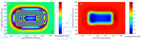 The above results demonstrate the theoretical application potential. However, in practical engineering scenarios, registration errors can significantly impact the method’s effectiveness. Additionally, factors such as noise and other influences further limit the regions where accurate retrieval using the reference phase method is possible, making them smaller than in the theoretical scenario [,]. To enhance the applicability of the reference phase retrieval method, exploring options such as using SAR data with higher resolution and longer wavelengths has been considered. For example, consider a horizontal working face oriented in the east–west direction, measuring 200 × 300 m. In this scenario, the utilization of L-band SAR data with the following parameters proves to be a crucial consideration: ascending orbits, 83.9° LOS azimuth, radar incidence angle of 42°, λ = 236 mm, and a mapping resolution of 2 m. Figure 8a shows the wrapped phase of LOS deformation simulated when the PIM inversion parameter is used. When the inversion parameters change by 20%, i.e.,, the wrapped phase of the difference of LOS phase simulated by the two groups of parameters is shown in Figure 8b, whose interference fringes become clearer and can be effectively unwrapped.
