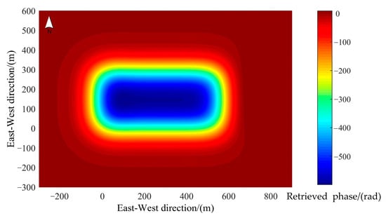 Figure 5a reveals that the wrapped phase fringes, representing the difference in the wrapped phase between the two interferograms, are noticeably clearer and more distinct compared to the actual interferometric phase fringes shown in Figure 4b. Furthermore, the fringe density in Figure 5a is significantly lower than that observed in the genuine interferograms, aligning with the theoretical analysis in Section 3.1. The residual phase, derived from unwrapping the wrapped phase, is added to the predicted phase to obtain the simulated true deformation phase, as depicted in Figure 6. The disparity between the retrieved deformation phase and the original phase exhibits a relative error ranging from –0.001 to 0.001 rad (equivalent to a deformation error of 0.009 mm). This indicates the suitability of the proposed method for phase retrieval.