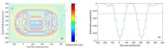 For computational convenience, we assume the presence of a horizontal working face with a primary section oriented in the east–west direction, measuring 300 × 600 m. The mining depth of the coal seam in this working face is 250 m, the maximum surface subsidence w0 is 3.5 m, the horizontal movement coefficient b is taken as 0.3, is taken as 1.6, and the inflection point offset is taken as 0 m. Utilizing the parameters mentioned above, we generate an actual subsidence basin based on Equation (2). Subsequently, we simulate the LOS subsidence basin using InSAR technology, following Equations (5) and (6). The basic parameters for C-band SAR data include ascending orbits, an 83.9° LOS azimuth, a radar incidence angle of 40°, and a wavelength (λ) of 56 mm. Figure 4 illustrates the simulated LOS deformation phase and the wrapped phase of the LOS deformation phase at an image resolution of 1 m.
