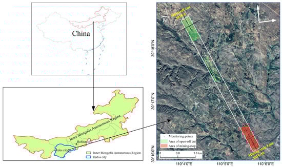 Shangwan Coal Mine, under the ownership of the Shendong Coal Group, holds significant importance as a production mine. This study is centered around the 12,401 working face within Shangwan Coal Mine. The surface elevation of this working face varies between 1188 and 1300 m, while the floor elevation ranges from 1043 to 1066 m. The coal seam has an average thickness of 9 m and an inclination of approximately 1 to 5°. The dimensions of the working face are 5000 m × 300 m, with a designed mining height of 8.6 m, and mining depths ranging from 150 to 250 m. The study area presents a hilly terrain plateau with relatively minor fluctuations. Sparse grasslands, bare sand, and shrubs predominantly cover the surface. Figure 9 offers an overview of the 12,401 working face, which is situated near the open-off cut area and the mining-stop area of the working face. In the upper right corner, there is a schematic diagram illustrating the orbit direction and LOS direction of the SAR data used in this article.