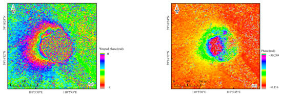 (a) Wrapped phase of LOS deformation phase. (b) Wrapped phase of the difference between the wrapped phases of the two interferograms.