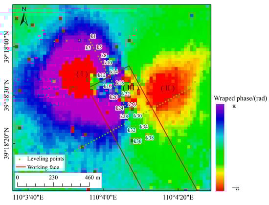 The processing of the two Sentinel-1A datasets using DInSAR technology is executed with the SARscape software. Consequently, the interferogram of the open-off cut area is generated, as depicted in Figure 12. This interferogram reveals two distinct deformation regions, denoted as Region (I) and Region (II), instead of a circular distribution. This pattern arises from the combined influence of the radar incidence angle and the deformation characteristics of the mining area. Due to the acute radar incidence angle, surface subsidence is observed along the LOS, indicating a sinking movement in the LOS direction. Region (I) exhibits horizontal movement in alignment with the LOS, resulting in heightened LOS deformation that may surpass the detectable deformation gradient of InSAR. In contrast, Region (II) displays horizontal movement opposing the LOS direction, reducing the deformation along the LOS and occasionally leading to surface uplift in the LOS direction. For a more comprehensive analysis, please refer to reference []. Region (III) corresponds to the central area of the subsidence basin and is characterized by inferior-quality interference fringes.