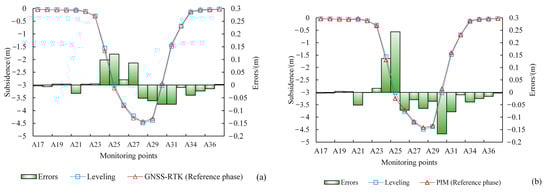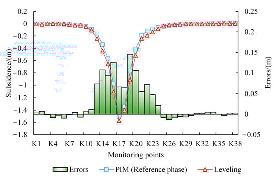 In Figure 14a, we observe the unwrapped phase of the remaining phase’s wrapped phase. Moving on to Figure 14b, the maximum phase obtained using the reference phase retrieval method measures approximately 337.37 radians. In contrast, Figure 14c displays the maximum phase unwrapped using the MCF method in the InSAR interferogram, which is only 6.7 radians, significantly lower than the actual deformation phase. We calculate the strike line depression angle using PIM parameters, as outlined in Equation (11), determining the strike line azimuth of the working face to be 151.1°. Consequently, we can calculate the subsidence of points on the strike main section in Figure 12 according to Equation (12). When comparing the leveling data with the subsidence values obtained by combining the reference phase retrieval method and the displacement vector depression model in Figure 15, we find that the maximum difference is 0.14 m, with a root mean square error (RMSE) of 0.05 m, accounting for 3.3% of the maximum subsidence. In contrast, Jiang et al. [] calculated three-dimensional deformation based on the Boltzmann function and subsidence characteristics, achieving an RMSE of subsidence compared to the measurement data, accounting for 9.4% of the maximum subsidence. This represents a 23.1% improvement in monitoring accuracy compared to the corresponding PIM prediction accuracy of 0.065 m. Errors in the edge areas of the basin are minimal, all within 0.01 m, while larger errors primarily occur in the central area of the basin. This can be attributed to the fact that at the resolution of Sentinel-1, the maximum deformation difference between adjacent pixels in the subsidence basin of the study area, as calculated by PIM, amounts to 0.16 m. This value exceeds the deformation difference of adjacent pixels (0.028 m) that can be monitored by Sentinel-1. The corresponding deformation difference of the residual phase between adjacent pixels, as determined by Equation (21), is approximately 0.016 m, slightly below 0.028 m. However, due to factors such as the accuracy of PIM prediction parameters, registration errors, resampling, terrain changes, and various sources of noise, the difference between the predicted deformation and the actual deformation may exceed the assumed value. As a result, the accuracy of phase retrieval based on PIM in regions with notable deformation gradients could be compromised.